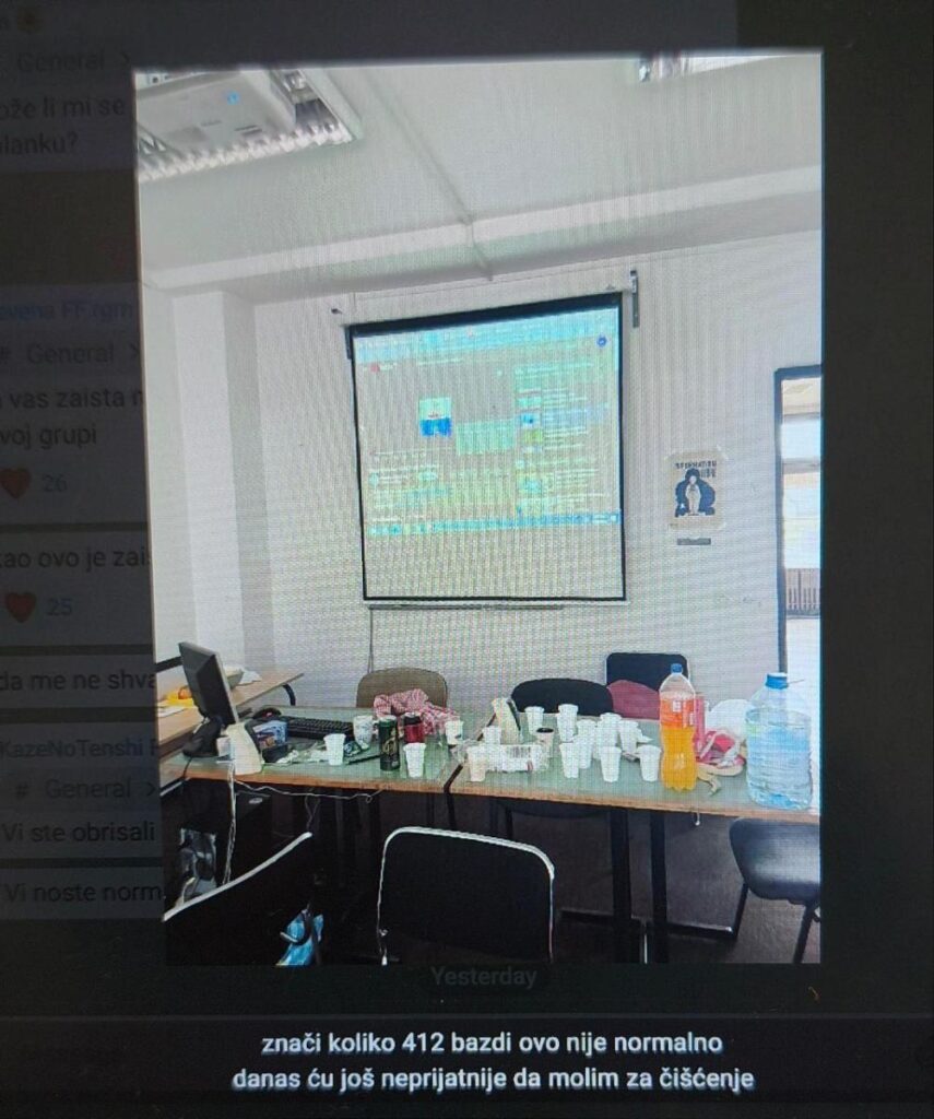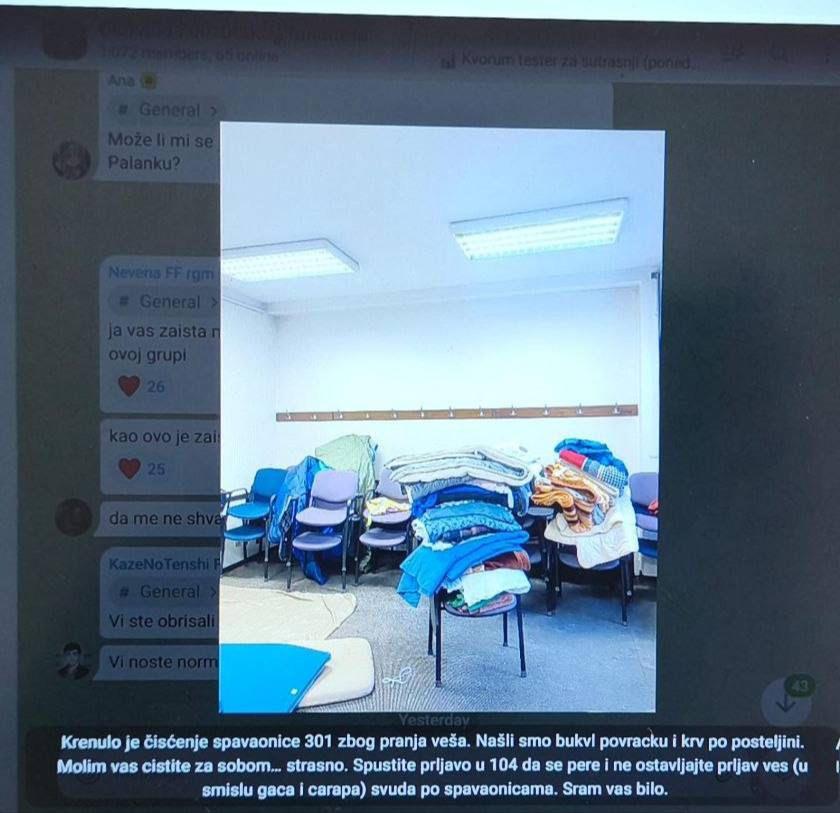 – Нашли смо буквално повраћку и крв… Молим вас, чистите за собом… Страшно. Спустите прљаво у 104 да се пере и не остављајте прљав веш (у смислу гаћа и чарапа) свуда по спаваоницама – наводи се у објави.