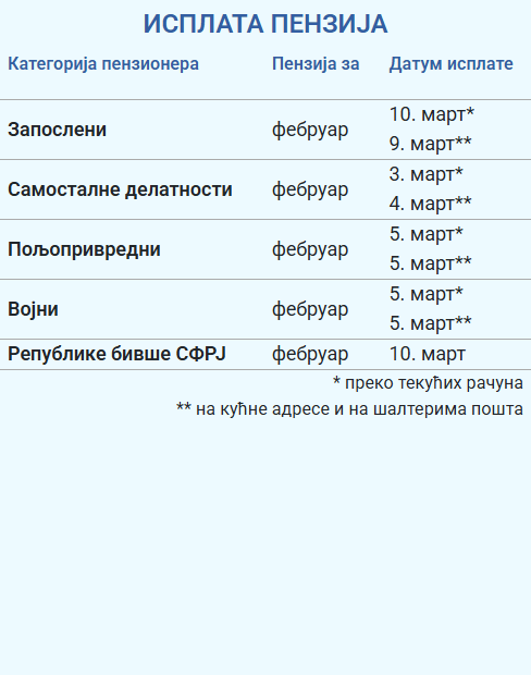 ПОЧИЊЕ ИСПЛАТА ПЕНЗИЈА ЗА ФЕБРУАР Ево ко први добија новац